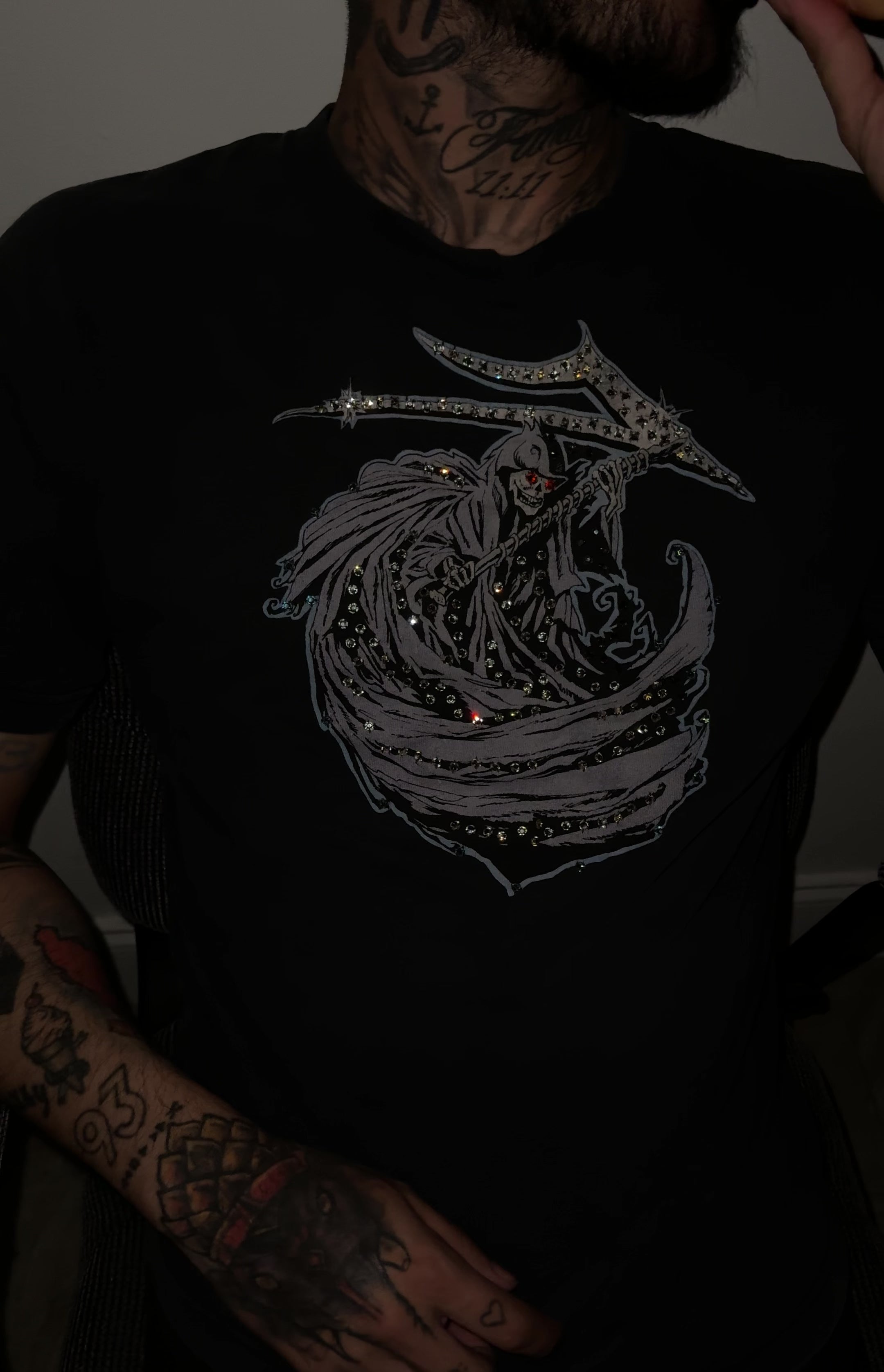 Vintage black tee featuring an intricate Grim Reaper graphic, custom enhanced with premium crystal accents for a striking, high-end look. Made from soft, worn-in cotton with natural fade, giving it both authenticity and edge.