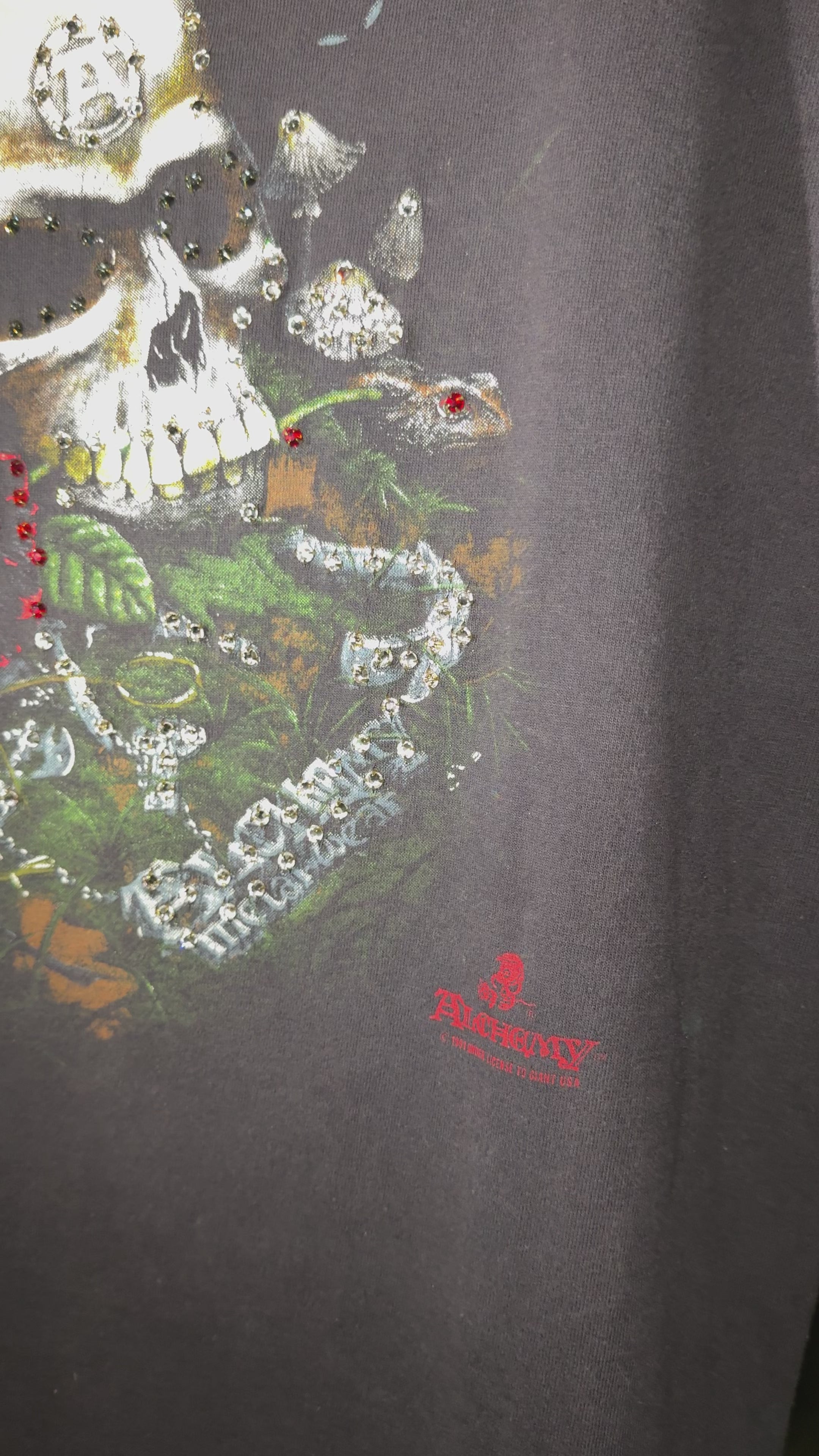 One-of-a-kind vintage sleeveless tee featuring a bold skull graphic with premium crystal embellishments. The piece combines authentic vintage wear with custom high-quality detailing for a standout look. Perfect for layering or wearing as a statement piece.